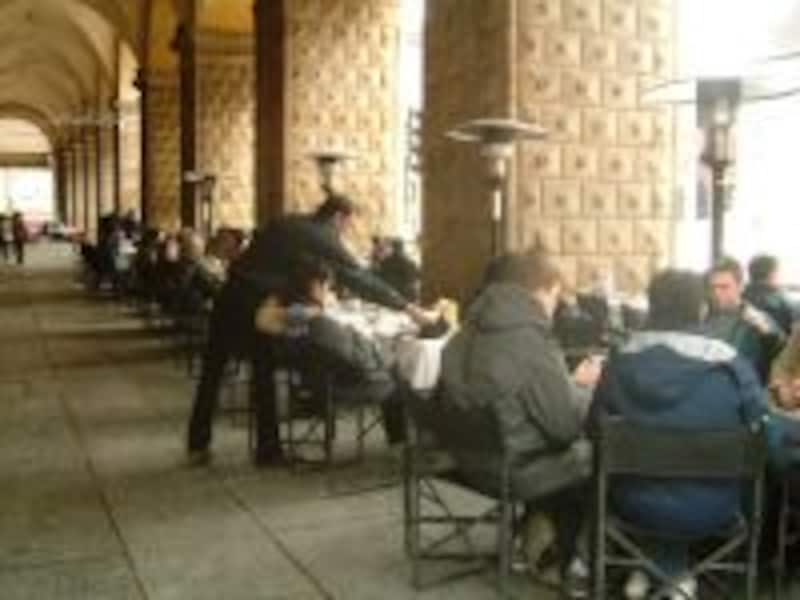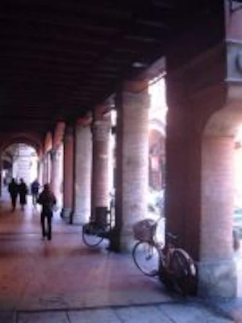 ヨーロッパ最古の大学があり、どことなくアカデミックな雰囲気が漂うボローニャの街。 赤いレンガとポルティコ(柱廊)が創る街の景観も独特です。 ポルティコとは、いわばアーケード。古い建物の一階部分が屋根付きの廊下状になっていて、 雨や強い日差しを避け、街の主要部分を行き来できる仕組みになっています。 カフェのテラス席になっていたり、職人さんが軒下で作業していたり、 生活の中に旨く取り入れられています。