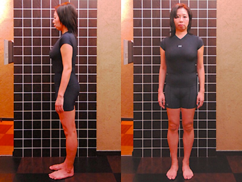 ひとしきり汗を出したらトレーニングウェアに着替えて骨格や筋肉のクセをチェック。通常はTシャツ&ショートパンツですが、今回は前後の撮影があるのでA子さんには体にぴったりしたものを着用してもらいました。