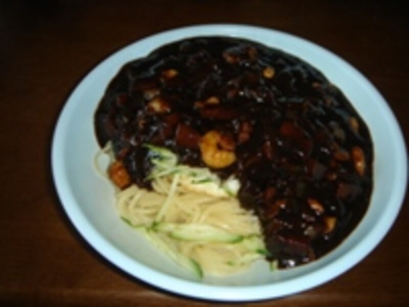 | 出前の定番としても大人気のジャジャンミョンにはいろいろな種類がある。写真はシーフードたっぷりのサムソンジャジャン。 |