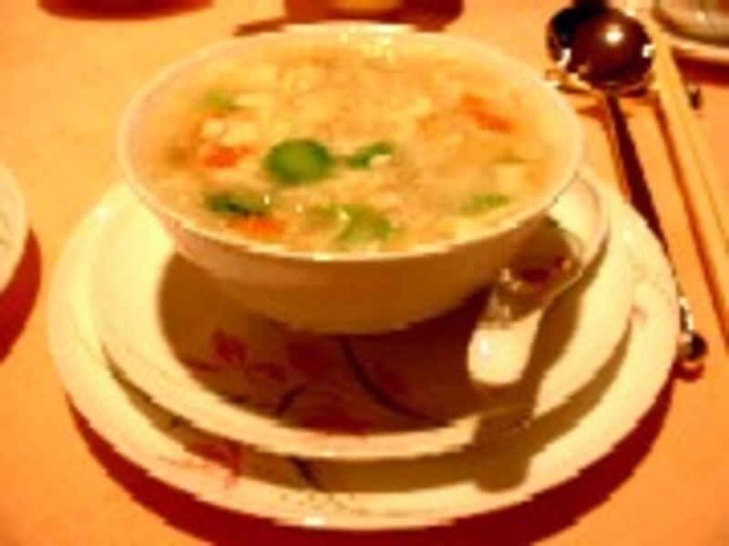 ホタテの味が染みわたったスープに鶏の細切り、そして柔らかい豆腐がふわっとしたスープです。