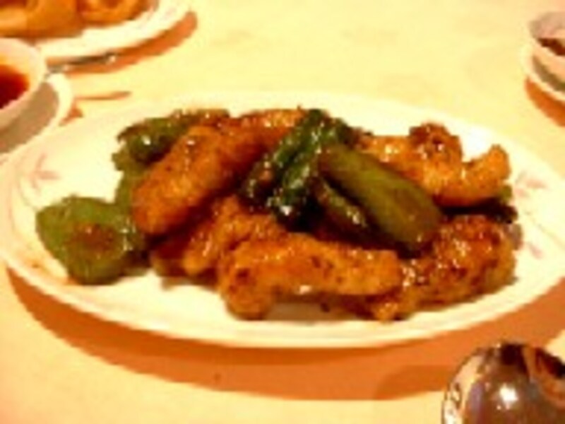 漢字が出ない料理名なので、英語表記をさせていただきました。ハタ科の一種である魚の肉厚な部分をニガウリと、納豆のルーツともされる大豆を発酵させた黒いソース「豆鼓」で、からめた料理。ニガウリも柔らかく、衣を着けてフライされた白身魚と妙にマッチして僕は好きです。