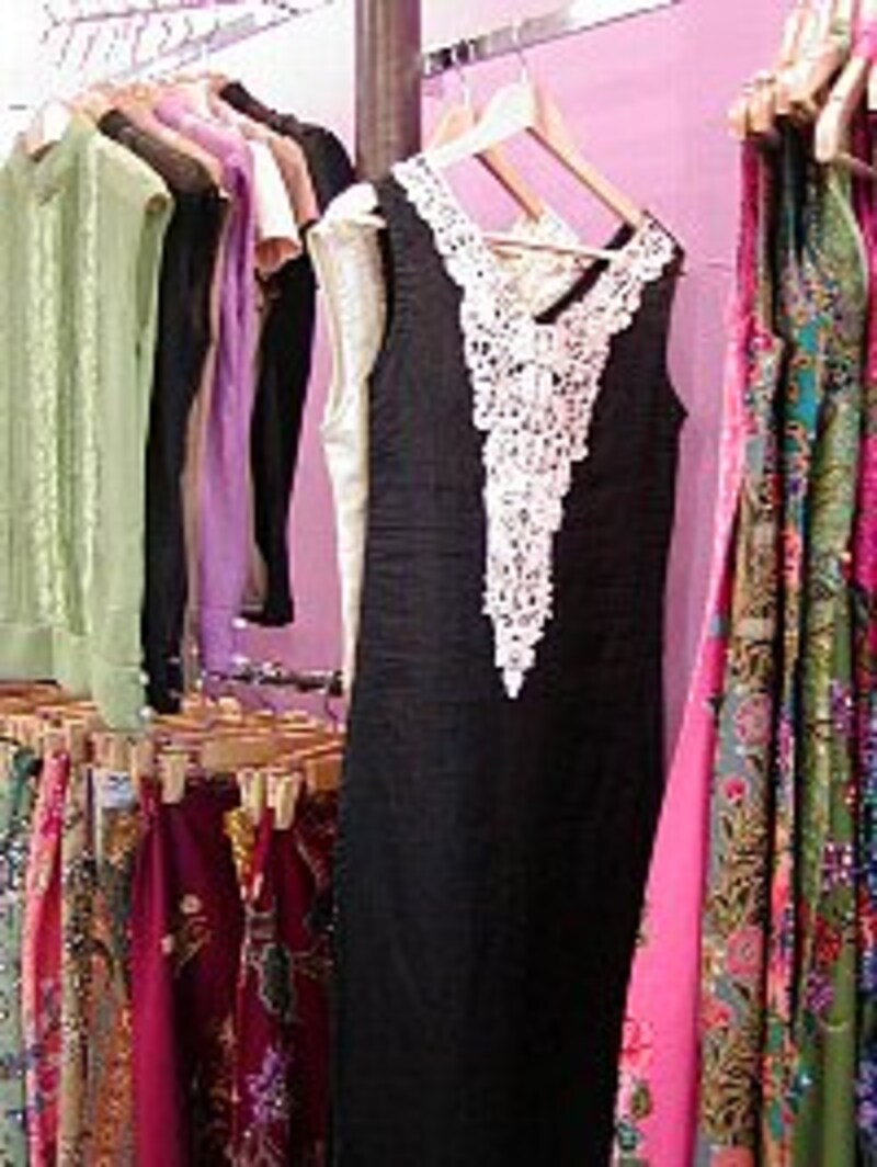 ビーズにスパンコール・・・ときたら、残すはレース!ですよね。『utopia』には、レースを使ったアイテムも、もちろん揃っています。その中で、私のイチオシは、黒の麻素材のシンプルなロング・ワンピース。深めに空いた胸元に、生成りのレース装飾がプラスされていて、よりいっそう女性らしいイメージを演出しています。このタイプのワンピースで、お値段は5000円~6000円ほど。まとめ買い、必至ですね!