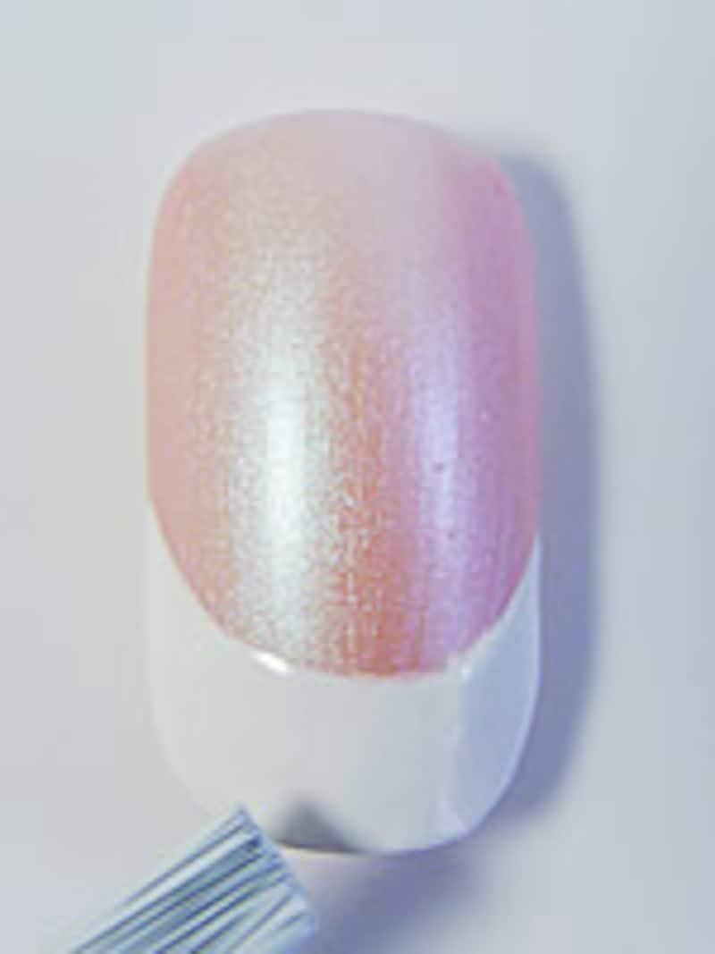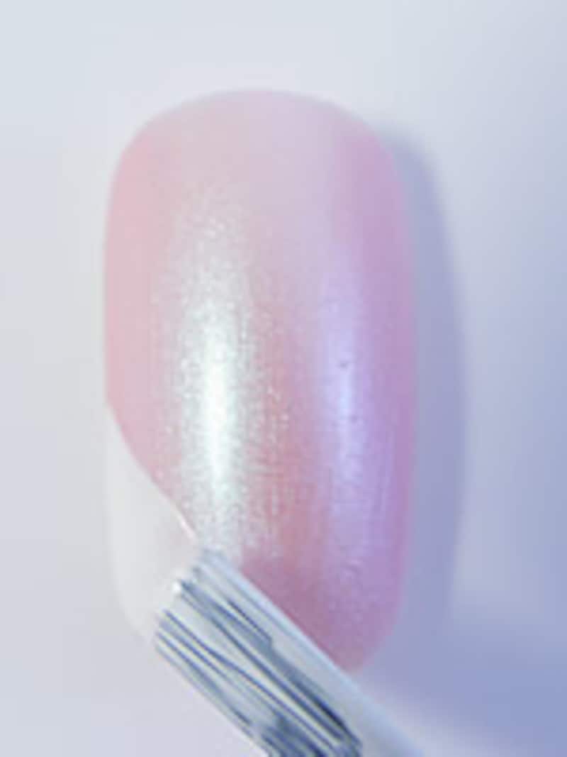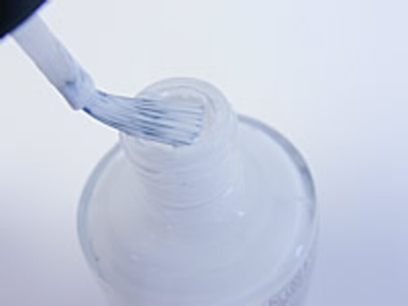 白のポリッシュの量が重要なポイント! ハケをボトルから出すときに縁でしごき、余分なカラーを除きます。ハケの片面のみにカラーがついている状態に。