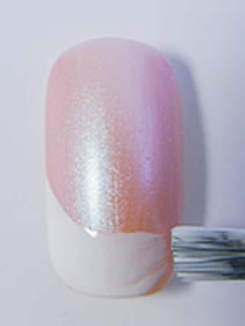 2. まずは左側からフレンチを描きます(左利きの場合は右からがやりやすいです)。一度ハケを置いたら、躊躇せずに塗るのが大切。ハケを止めてしまうとポリッシュの量が均等にならずムラになります。
