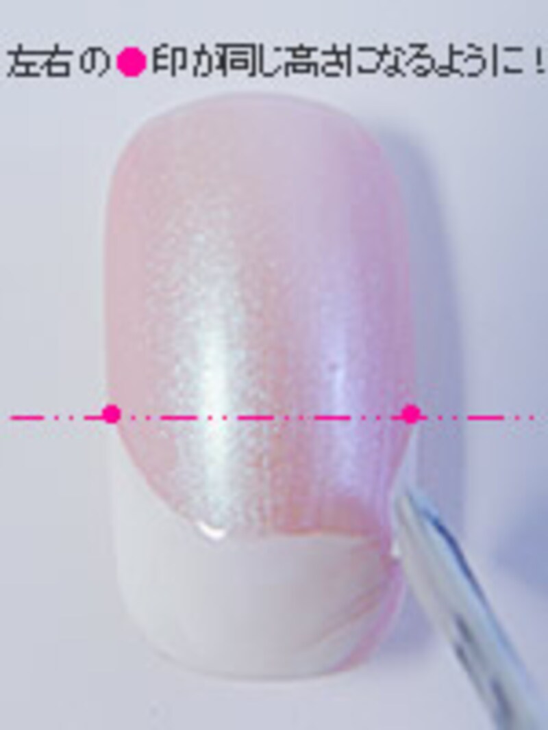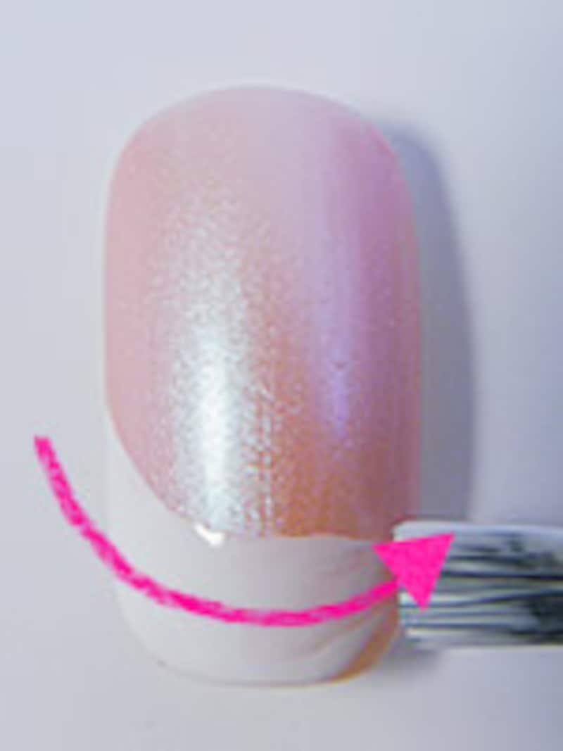 4. 理想的なハケ運びのルートです。最後は気持ち右上がりにしておくと、美しいフレンチカーブに仕上がります。ここが一番難しいポイントになるので、ネイルチップなどで練習を重ねてみるのも良いでしょう。