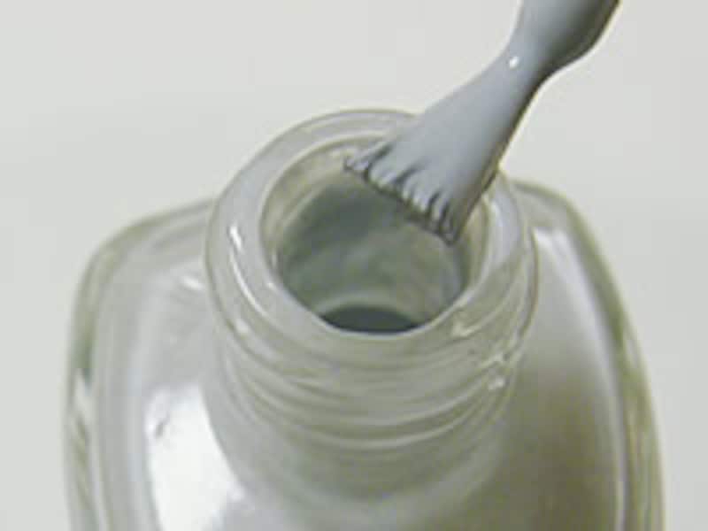 2. ボーダーを描く際には、ハケとポリッシュの量が重要なポイントになります。余分なポリッシュはボトルの口でよくしごき、ハケをフラットな形に整えます。