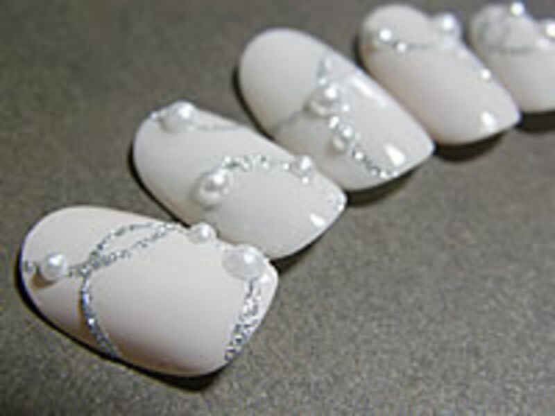 ラインで描くサークルデザインに上品なパールをあしらった、エレガントネイル決定版!