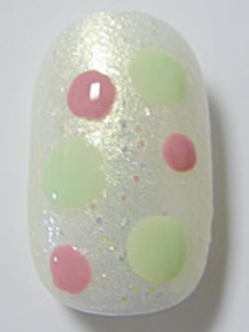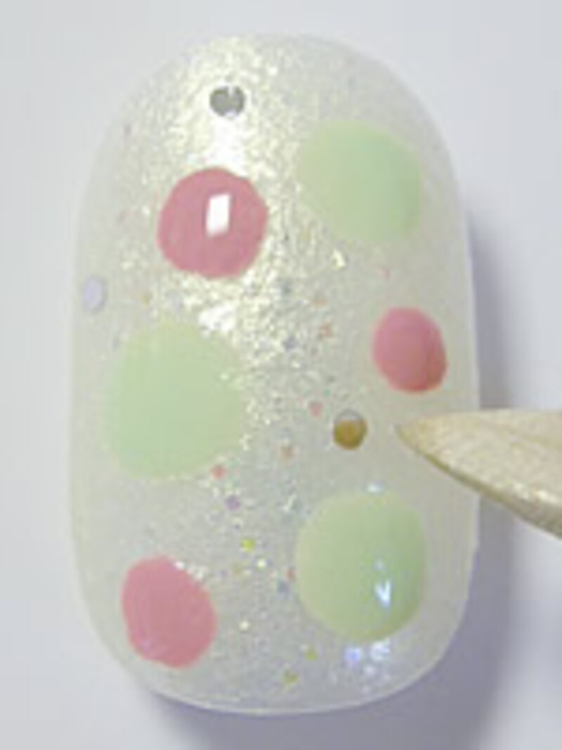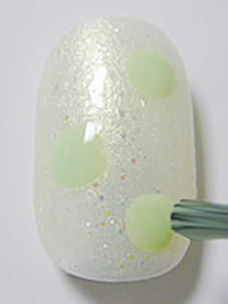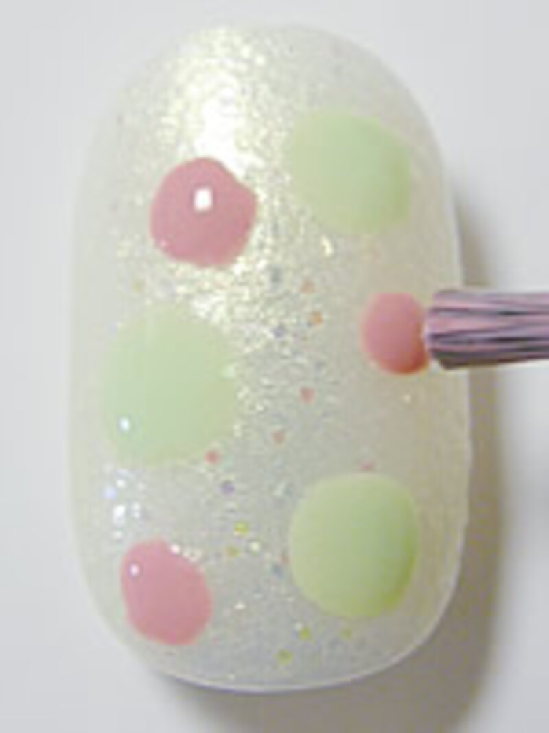 ココがPOINT! ベースカラーが乾かないうちにドットを作るのがポイントです。表面張力の作用によってドットカラーが自然にきれいな円型に広がってくれます。