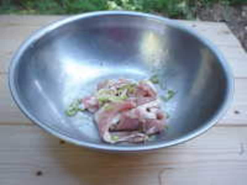 買ってきた肉(牛肉、豚肉、鳥肉など何でもOK)を焼く直前、その肉が入る大きさのボールか鍋(大きめの方が良い)にお肉を投入。