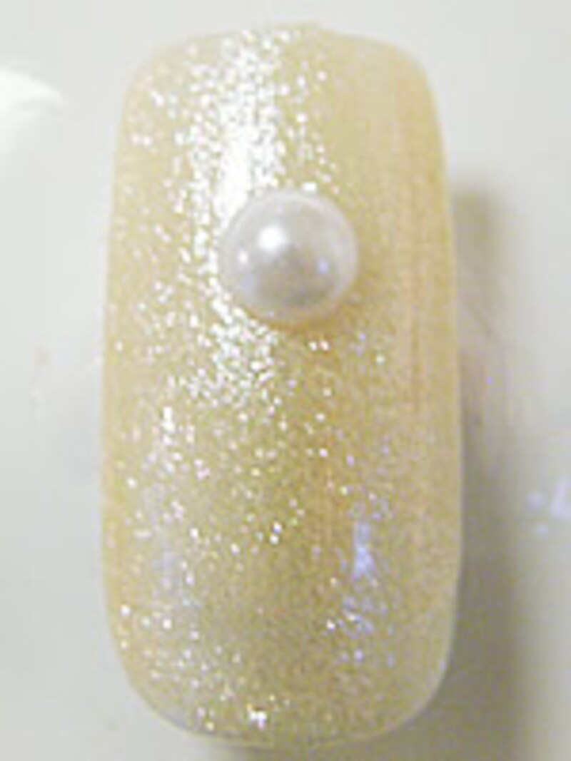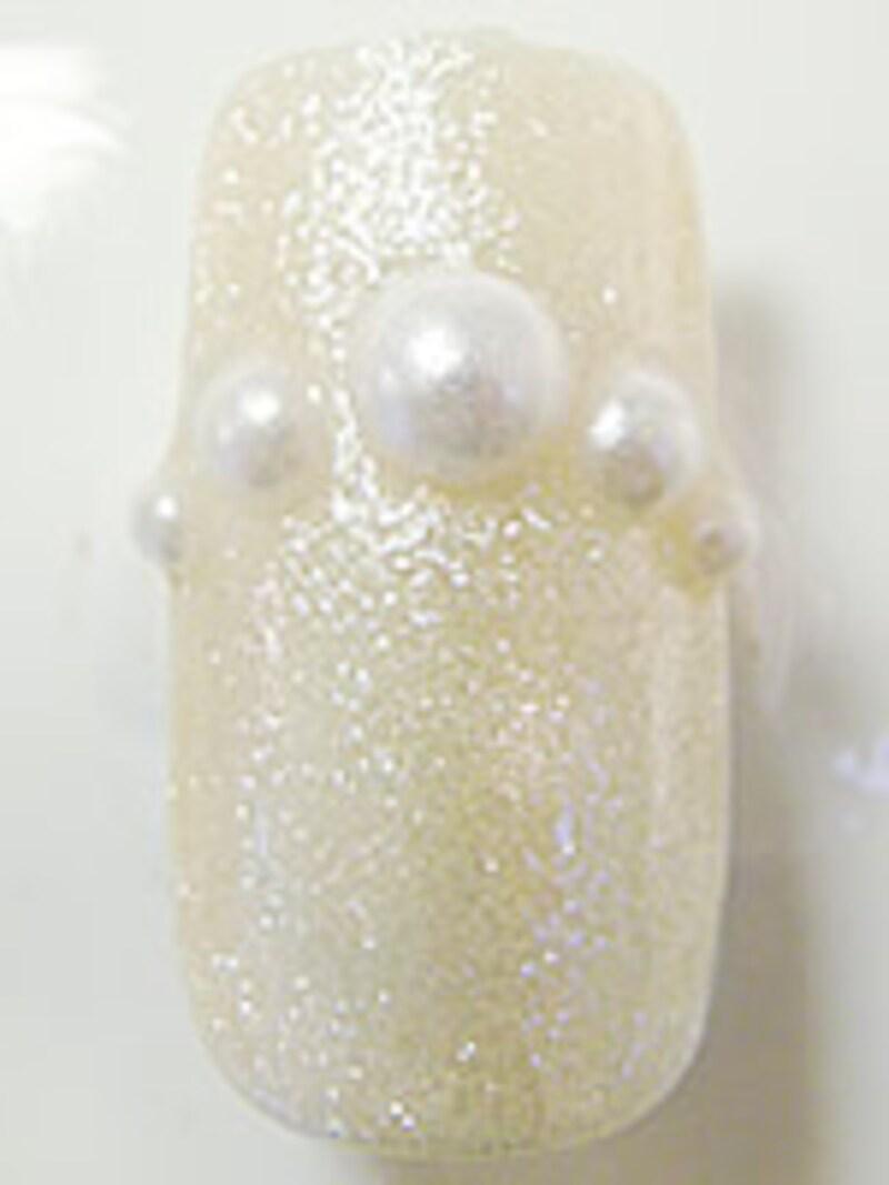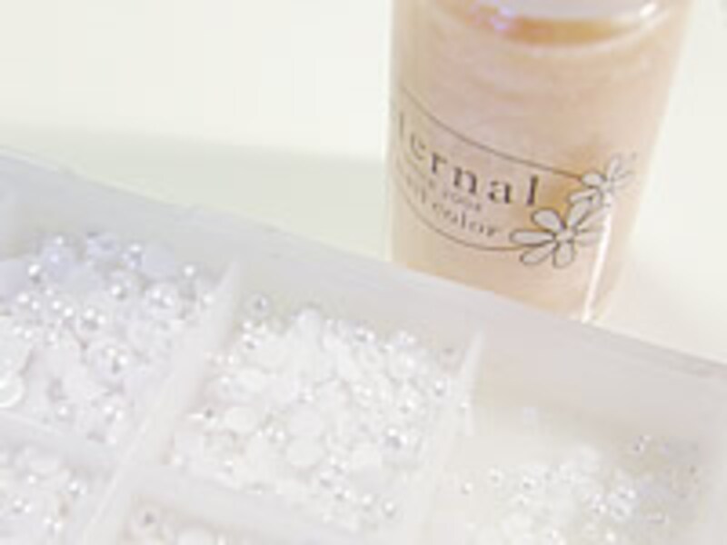 | ・エターナルネイルカラーENN-104 発売元:株式会社ディアローラ(商品ページ) ・パールストーン1.5mm~4mmホワイト 販売店:ラインストーン99(商品ページ) |
