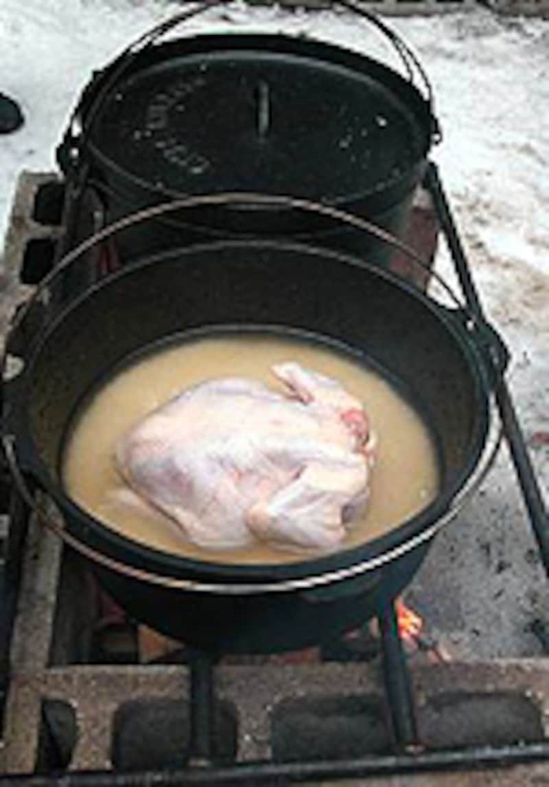 ダッチオーブン料理の登場は、料理する暇があったら野山で遊んでいたい、そんなお父さんたちに朗報でした。米入れて、丸鳥入れて、だし汁入れて焚き火に埋めておけば、火が消える頃には勝手に炊き上がってる鳥ご飯。正味「3分もいらないクッキング」に、ハマる人続出中です。ぜひ作ってみてください。【材料(4人前)】