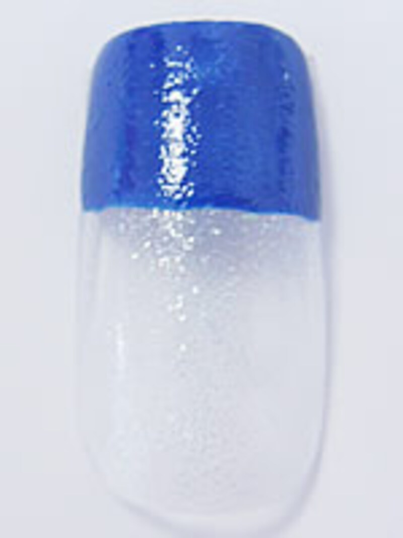 1. フレンチカラー(essie 679)を2度塗りします。今回はフレンチカーブを付けずにまっすぐなラインで塗ります。お好みでベースにはクリアータイプのグリッターポリッシュを塗るのもオススメです。