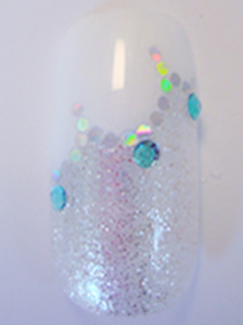 4. レース模様の外側にストーンをのせます。今回はブルージルコンを使用しましたが、お洋服の色や小物の色に合わせて、カラーを選んでも良いでしょう。