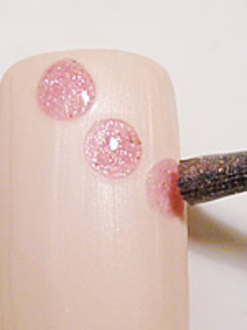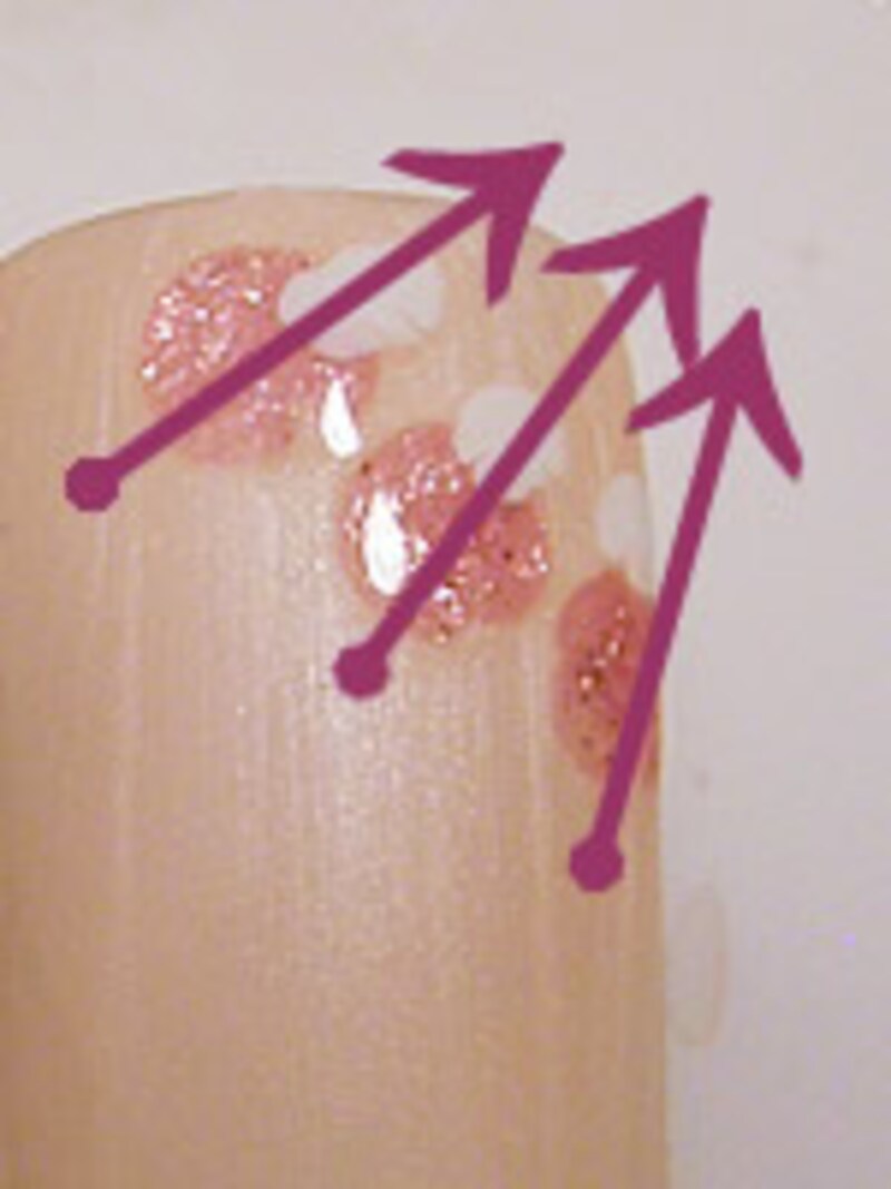 2. ベースカラーが乾かないうちにピンクのカラー(shareydva44)を画像のように乗せます。垂らすほど量は多くなく、ハケの断面を使ってスタンプを押す感覚です。ベースが乾いていない為、自然に円を描くようにじわっと広がっていくのを確認しましょう。