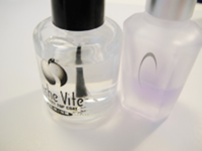 ポリッシュを塗った後の仕上げとして塗ります。ネイルカラーの発色を長持ちさせます。またネイルアートの仕上げとしても使う重要なアイテムです。透明タイプのトップコートが最も一般的ですが、薄紫色のタイプもあり、UVが配合されています。紫外線などからのダメージをカットし黄ばみにくくさせる効果があります。