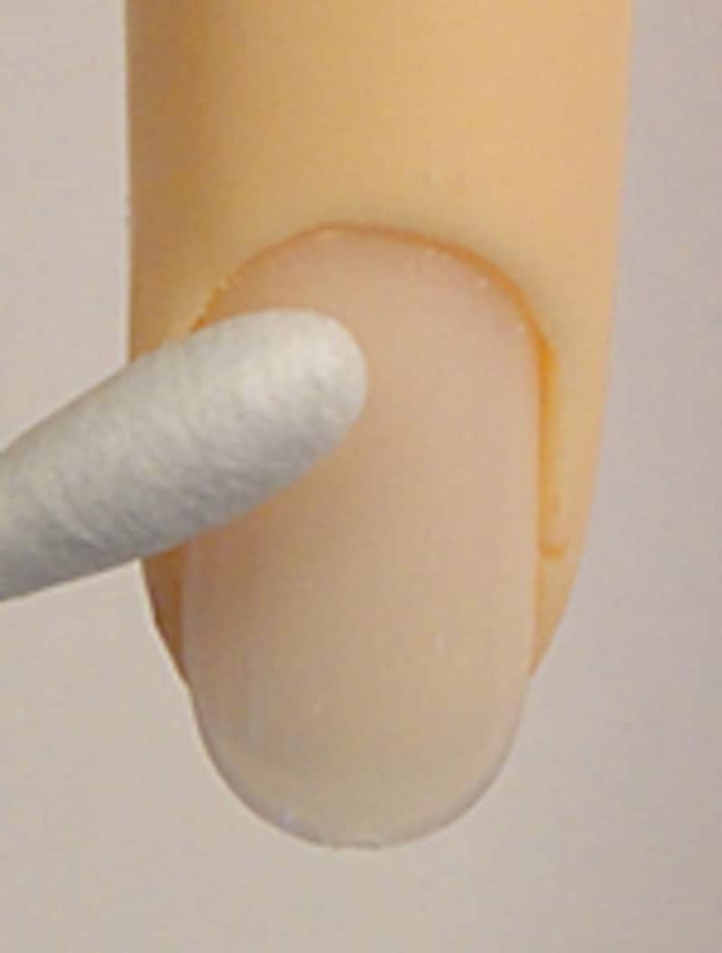 1. カラーリングをする前に、エタノールを含ませたコットンなどで爪の表面の油分を落とします。エタノールが無い場合は、ハンドソープで手をよく洗います。