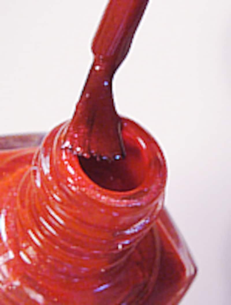 3. ポリッシュを使う時は、ハケの片面をボトルの縁でよくしごいて適量を取ります。この時にやや強めにしごくことによってハケ先が扇形のように広