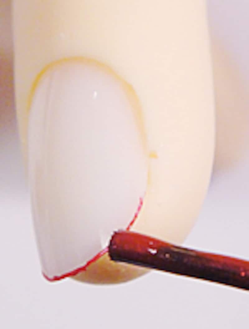 7. はみ出してしまった箇所は、ウッドスティックに除光液をつけて修正します。ウッドスティックはあらかじめファイルで先を尖らせておくと便利です。