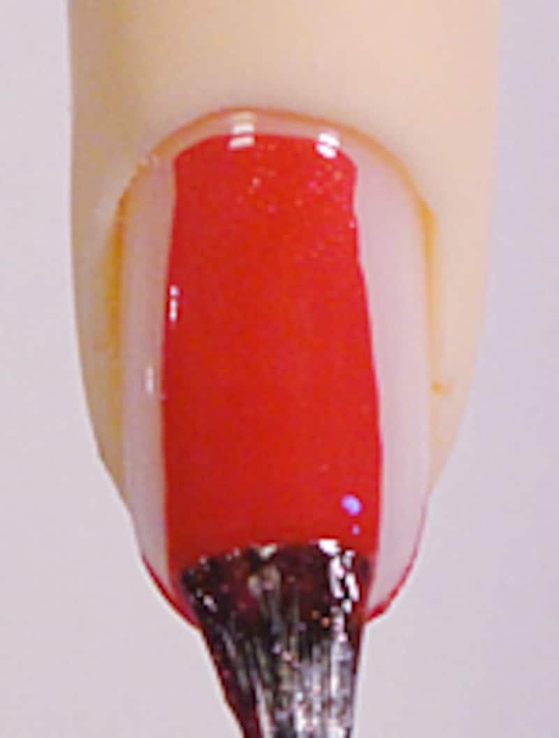 5. ポリッシュを爪の表面に塗ります。ムラにならないように中央→左側→右側の順に3~4回の刷毛運びで塗り終わるように心掛けましょう。