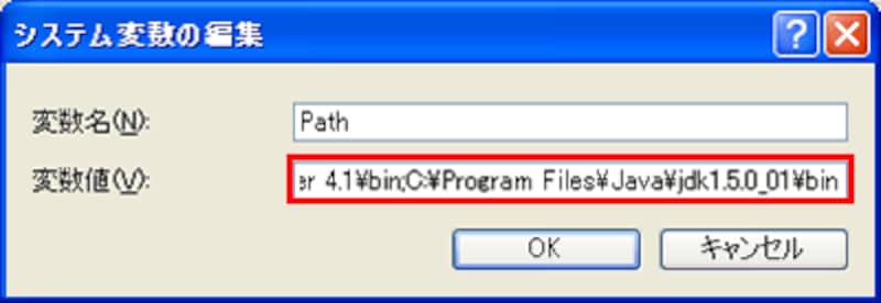 もし、Javaのプログラムがうまく動かず、環境変数を調べてみたら既にclasspathという名前の変数があった、というような場合は、このclasspathの値にJavaが必要とするフォルダのパスを追加してやる必要があります。先に示した手順でシステムコントロールパネルを開き、変数classpathの編集ウインドウを呼び出して、現在の値の後に以下のように追記をします。