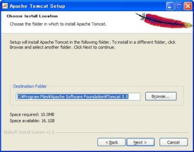 ・インストールする場所を指定します。通常は、「Program Files」フォルダ内に「Apache Software Foundation」というフォルダを作り、この中にTomcatをインストールします。