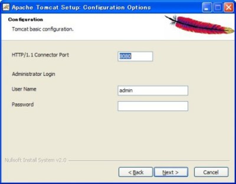 ・コンフィグレーション設定。これは使用するポート番号と管理者名、パスワードを入力します。ポート番号は通常「8080」に設定されています。