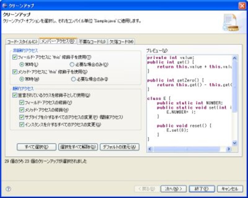 クラス内のメンバー(フィールドやメソッド)を利用する場合のルールを設定するものです。thisやクラス名をつけて記述するかどうかを指定します。これも、よくわからなければ基本的に全部ONにしてしまいましょう。