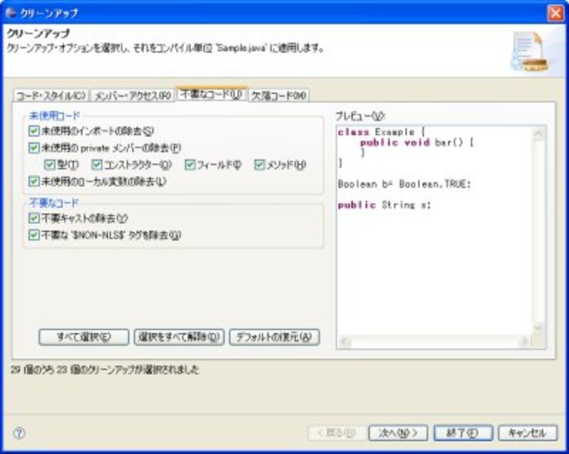 未使用コード――全く使われていないimport文、フィールド、ローカル変数を削除するためのものです。