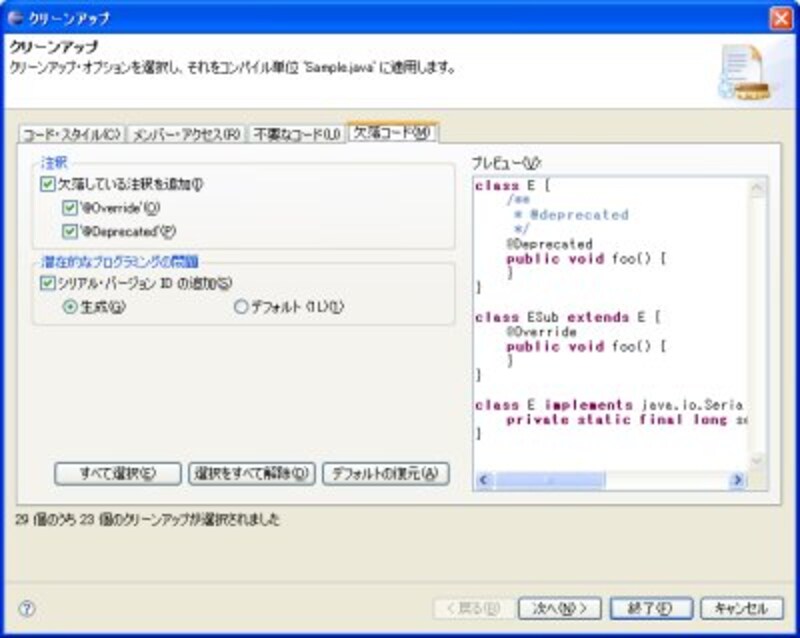 こちらは反対に「足りないソースコード部分」を埋めるためのものです。注釈が抜けているもの、JavaBeansのシリアルバージョンIDが書かれていないものを自動的に埋め合わせます。
