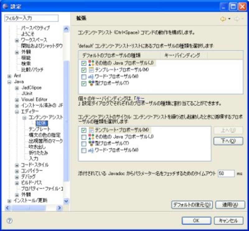 | 「Java→エディター→コンテンツ・アシスト→拡張」でアシストの種類をON/OFFできる。 |