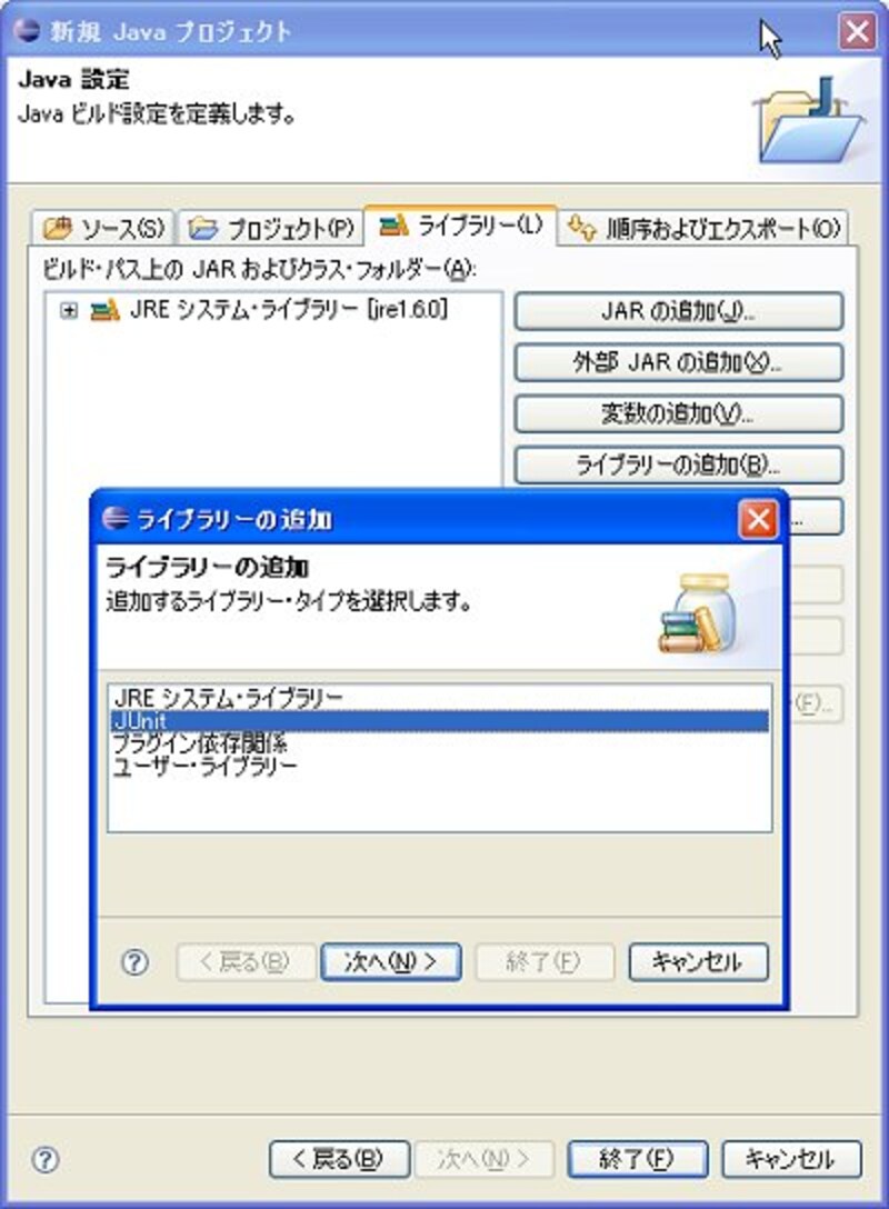 続いて「Java設定」の画面になりますが、ここで「ライブラリー」タブを選択し、「ライブラリーの追加」ボタンを押してください。Eclipseに用意されているライブラリーを選択するウインドウが現れます。ここから「JUnit」を選択して「次へ」ボタンを押します。