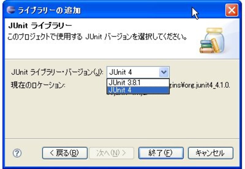 使用するJUnitのバージョンを選択する画面になります。ここでポップアップメニューからバージョンを選んでください。ここでは「JUnit 4」を選択しておきます。