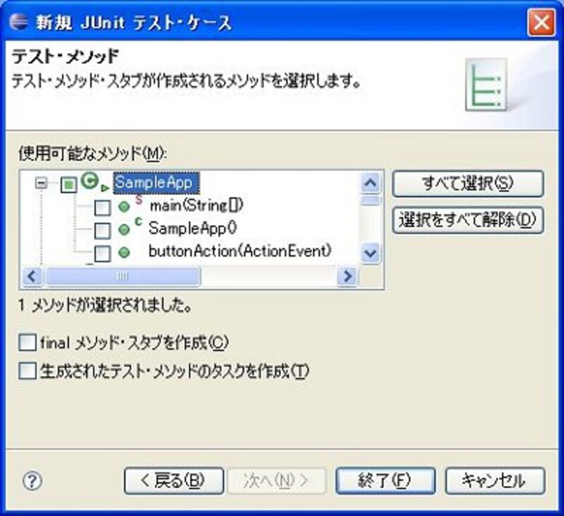 | テスト・メソッドを作成するメソッドをチェックする。こうすると、そのメソッドをテストするためのメソッドがあらかじめ用意される。 |