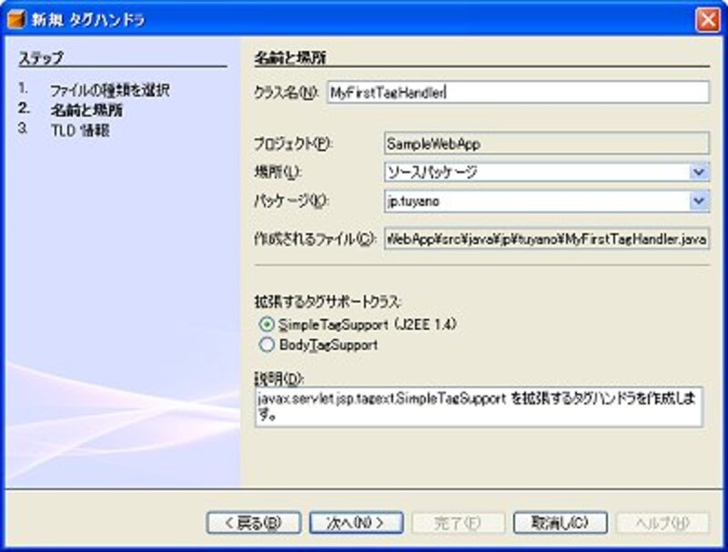 続いての画面で、クラス名に「MyFirstTagHandler」と記入をします。これが今回作成するタグハンドラクラスの名前です。またパッケージには「jp.tuyano」としておきましょう。その下にある「拡張するタグサポートクラス」は、作成するタグハンドラクラスのスーパークラスとなるものを指定するものです。ここでは、もっとも簡単なタグハンドラである「SimpleTagSupport」を選択しておきましょう。