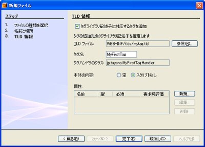 最後の設定画面です。「タグライブラリに記述する対応タグを追加」のチェックをONにし、TLDファイルの「参照」ボタンを押して、先ほど作成したタグライブラリ記述子「mytag.tld」を選択しましょう。またタグ名には「myFirstTag」と入力しておきます。その下にある「属性」のところは、今回は何も設定しないことにします。