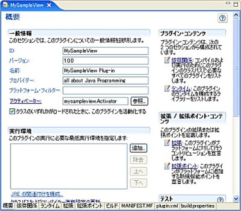 これらは、プラグインの名前やバージョン、ベンダー、必要なバンドルパッケージなどの情報をまとめたものです。プラグインがEclipse内から呼び出される際に、これらの情報を元にプラグインを作成したり管理します。先にプロジェクトを作成する際に表示されていた名前などが、そのままここに記述されていることに気づいたことでしょう。
