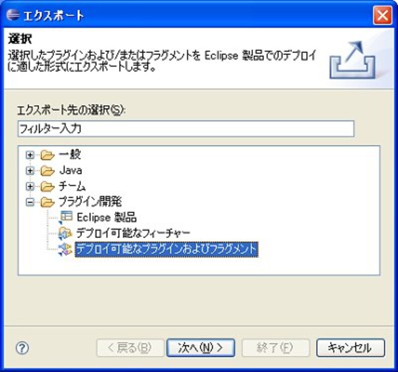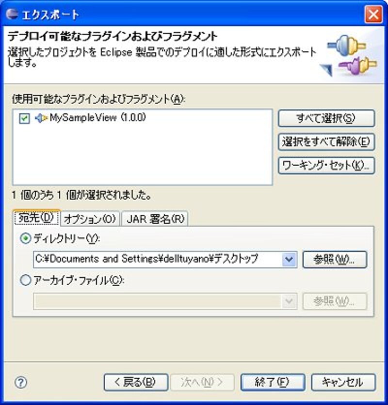 次のページに進み、使用可能なプラグインおよびフラグメントから「MySampleView」のチェックをONにします。そして「宛先」タブにある「ディレクトリー」を選択し、参照ボタンで出力先のフォルダを選択します。これで終了すれば、選択したフォルダに「plugins」フォルダが作成され、その中にプラグインのJARファイル(ここでは、「MySampleView_1.0.0.jar」ファイル)が作成されます。