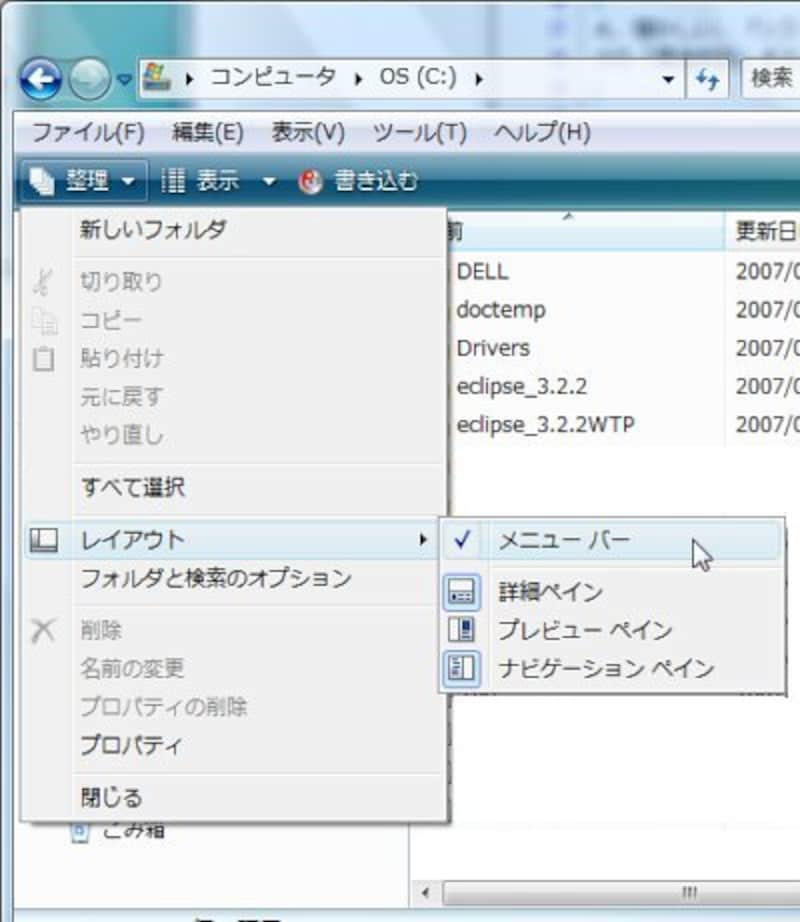 これだけではまだ使いにくいので、このウインドウにXPなどで表示されたメニューバーを表示させましょう。ウインドウ内の「整理」をクリックし、現れたメニューから<レイアウト>内の<メニュー>を選んでください。これで懐かしい、メニューバーがウインドウ内に表示されるようになります。