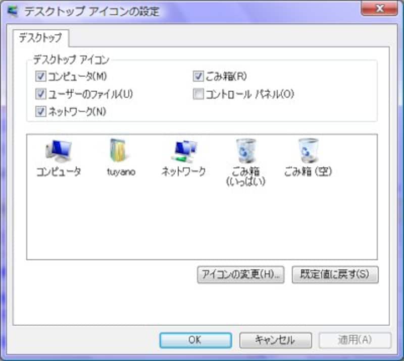 | 「デスクトップアイコンの変更」で、デスクトップに表示するアイコンを設定できる。 |