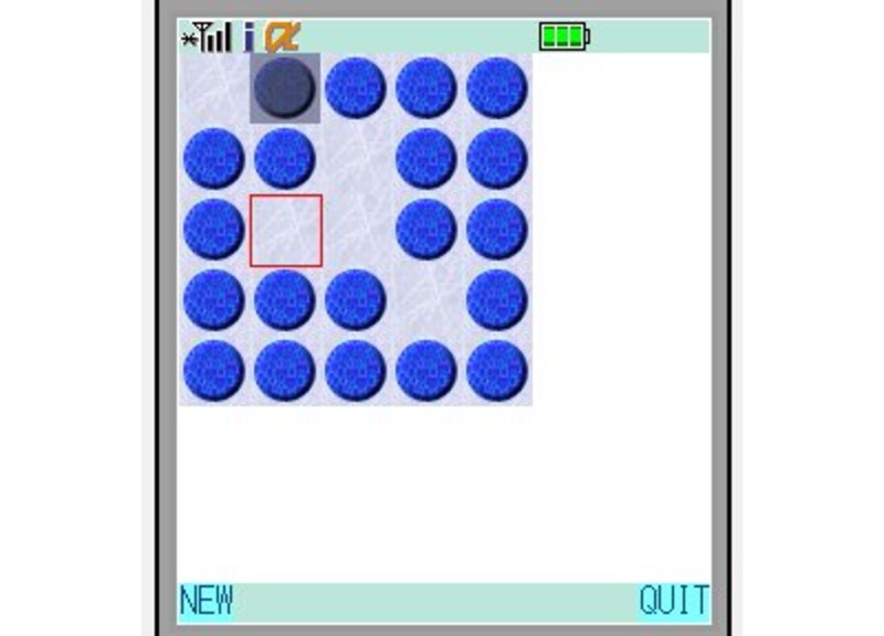 例として、「ソリティア・ゲーム」を作ってみましょう。コマをジャンプしてとっていくシンプルなゲームです。iアプリを起動し、「NEW」ボタンを押すと、新しい画面がセットされます。ここで、画面のコマを、その横にあるコマをジャンプした向こうに移動すると、飛び越えたコマを消すことができます。