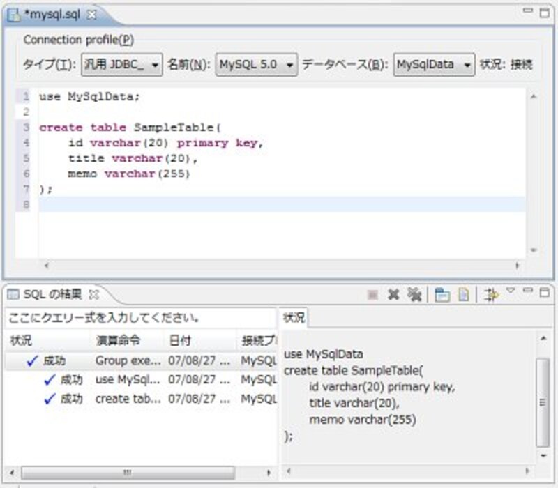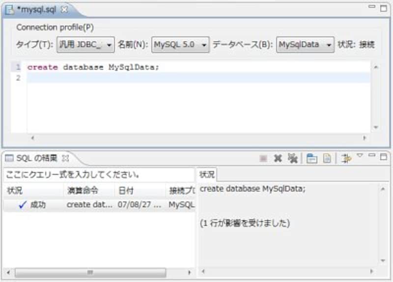 このSQLファイルは、SQLコマンド(クエリー)を記述して実行するものです。では、まずデータベースの作成から行いましょう。――実をいえば、接続プロファイルには「MySqlData」というデータベースに接続するように設定をしてありましたが、このMySqlDataが自動的に作られるわけではないのです(これはデータベースによって異なります。Java DBなどでは自動的に作成することも可能です)。