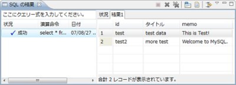 これで、「SQLの結果」ビューの中に「結果1」というタブが作成され、そこにレコードの一覧が表示されます。基本的にSQLのクエリーを発行しては結果を確認する、という形ですので、SQLがわからないと操作できないという欠点はありますが、「Eclipseの中からささっとデータベースを操作できる」という点はなかなか魅力的ではないでしょうか。一度、「Eclipse内からのSQLアクセス」の妙味を体験してみてください。