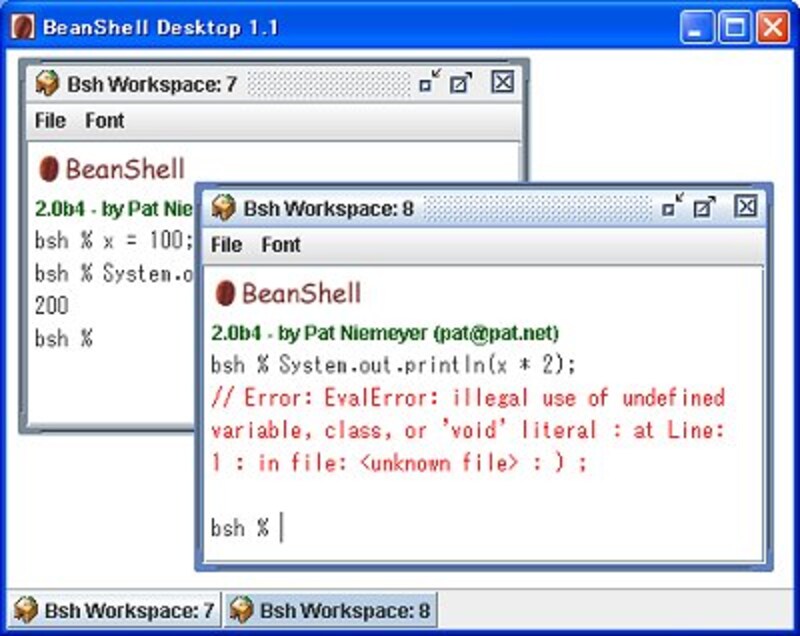 このように、BeanShellでは、ウインドウごと(というより、実行しているシェルごと)に実行される内容は独立して管理されます。あるシェルから実行した結果は、そのシェルの中だけで通用するのです。