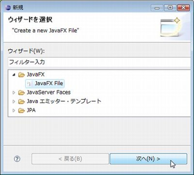 | 新規作成のウィザード画面で「JavaFX File」を選ぶ。 |