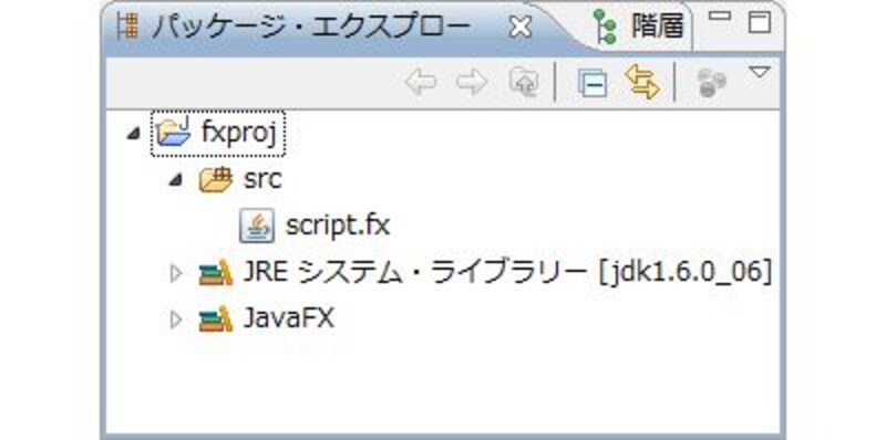 | パッケージ・エクスプローラーを見ると、スクリプトファイルの他、JavaFXのライブラリが組み込まれることがわかる。 |