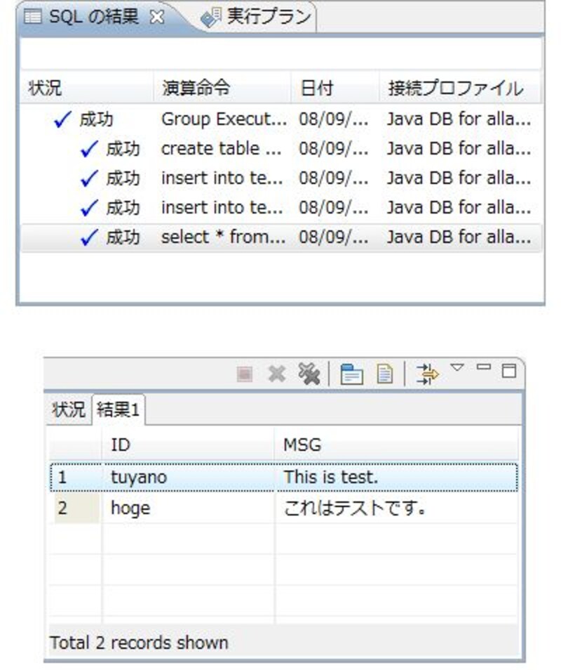 実行結果は、「SQLの結果」ビューに表示されます。ここに、「成功」という項目が表示されれば、コマンドは正しく実行されたことになります。項目を展開すると、実行した各コマンドがリスト表示されます。一番下の「select * from testdata」の項目を選択してみましょう。右側の「結果1」というタブに、testdataテーブルのレコードが一覧表示されます。ダミーとして作成したテーブルとレコードが確かにデータベースに保存され、それを取り出して表示していることがわかりますね。