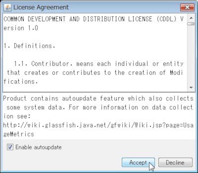 しばらく待っていると、ライセンス許諾の画面が現れます。下までスクロールし、「Accept」ボタンをクリックします。