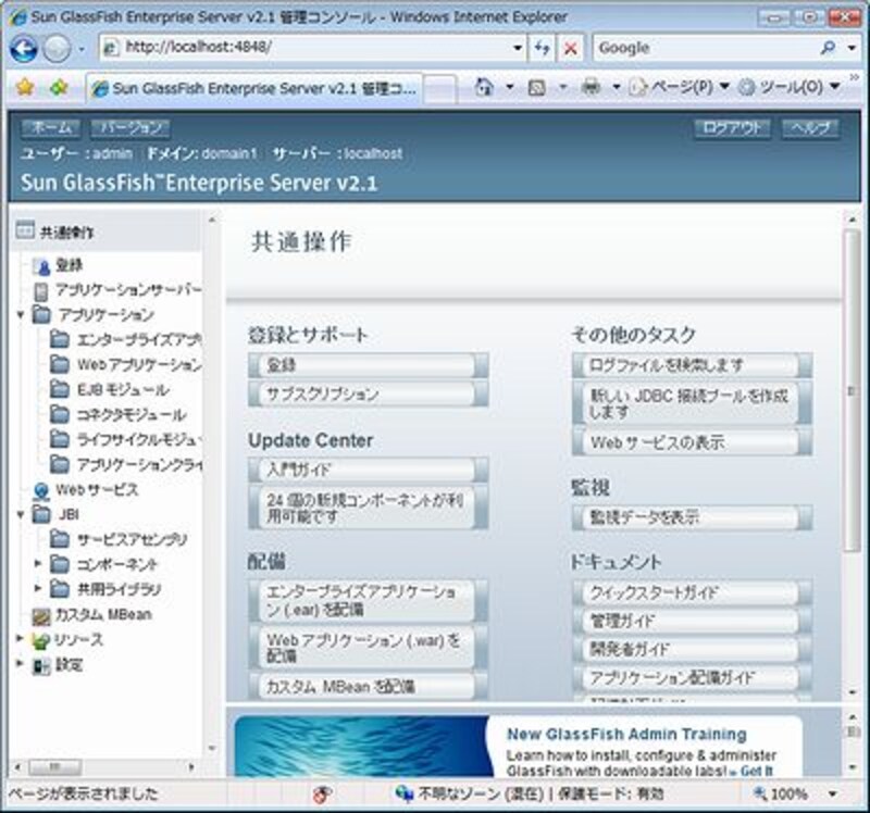 ログインすると、GlassFishサーバーのさまざまな設定を行うための管理画面が現れます。左側にメニュー項目が階層的に表示され、そこから項目をクリックして選ぶとその内容が右側に表示されるようになっています。