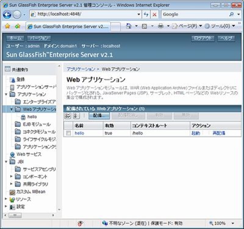 この中で、とりあえず覚えて起きたいのは「アプリケーション」の項目でしょう。この中には「エンタープライズアプリケーション」「Webアプリケーション」「EJBモジュール」などといったサブ項目が用意されています。これらは、それぞれのプログラムの公開に関する管理ページなのです。