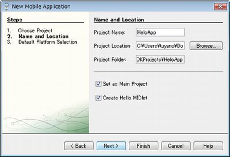 Project Location――プロジェクトの配置場所です。デフォルトでは、「ドキュメント」フォルダの中に「JavaMESDKProjects」というフォルダを作成し、その中に保存をします。これは特に理由がない限り変更しません。